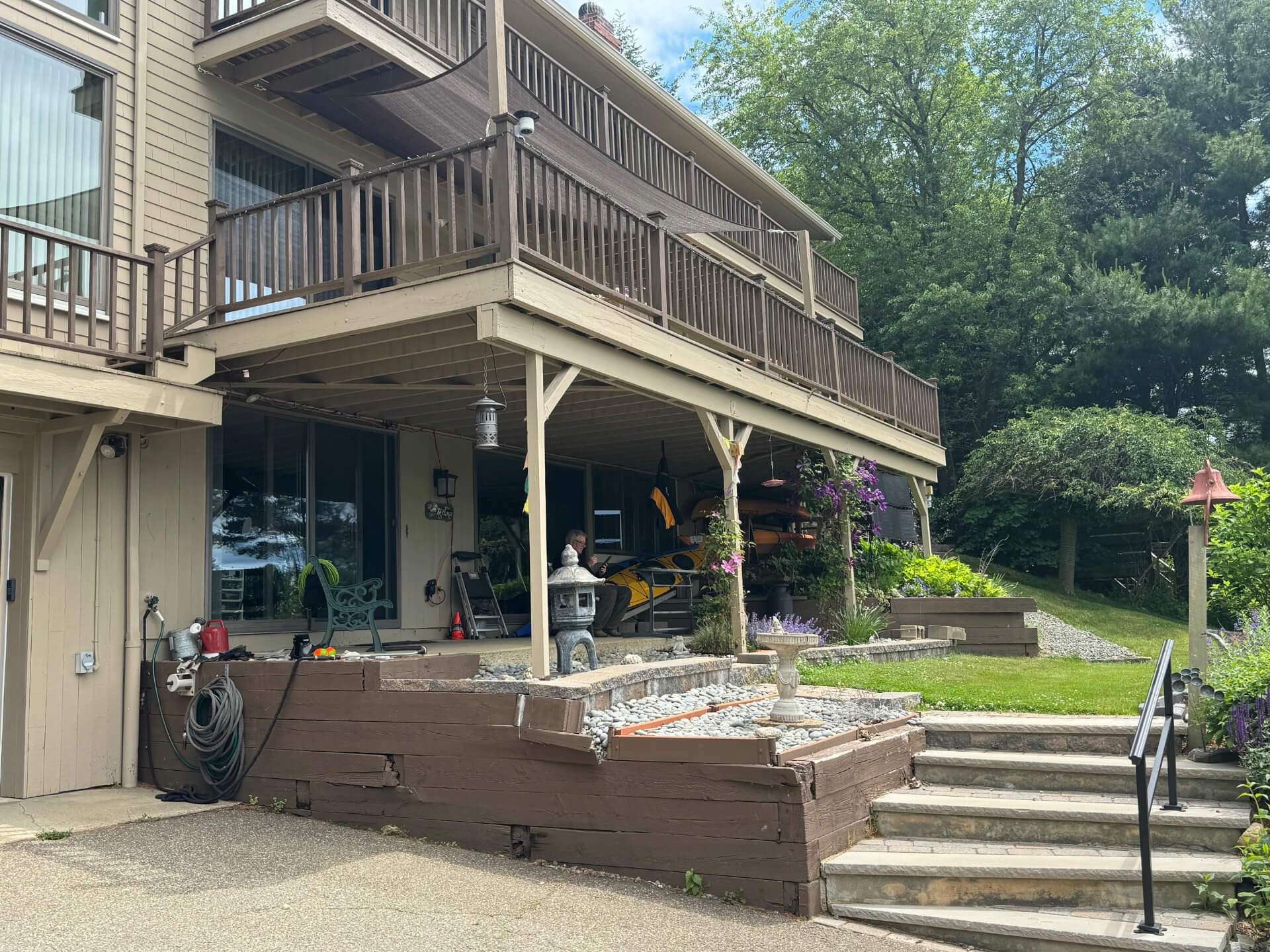 The old railroad tie retaining wall was rotting away and some timbers were failing and cracking. Dirt was starting to wash down onto the driveway so Artistic Landscapes designed a new segmental retaining wall utilizing Unilock's Concord XL style blocks. A deep footing was built with over 4' of crushed stone for the wall to be built on top of. Drainage stone is behind the wall and separated from the loam with a layer of landscape fabric. The client loves that we were able to create a natural outdoor space for them with wall stones that have crisp edges and variations of color while keeping a consistent look.